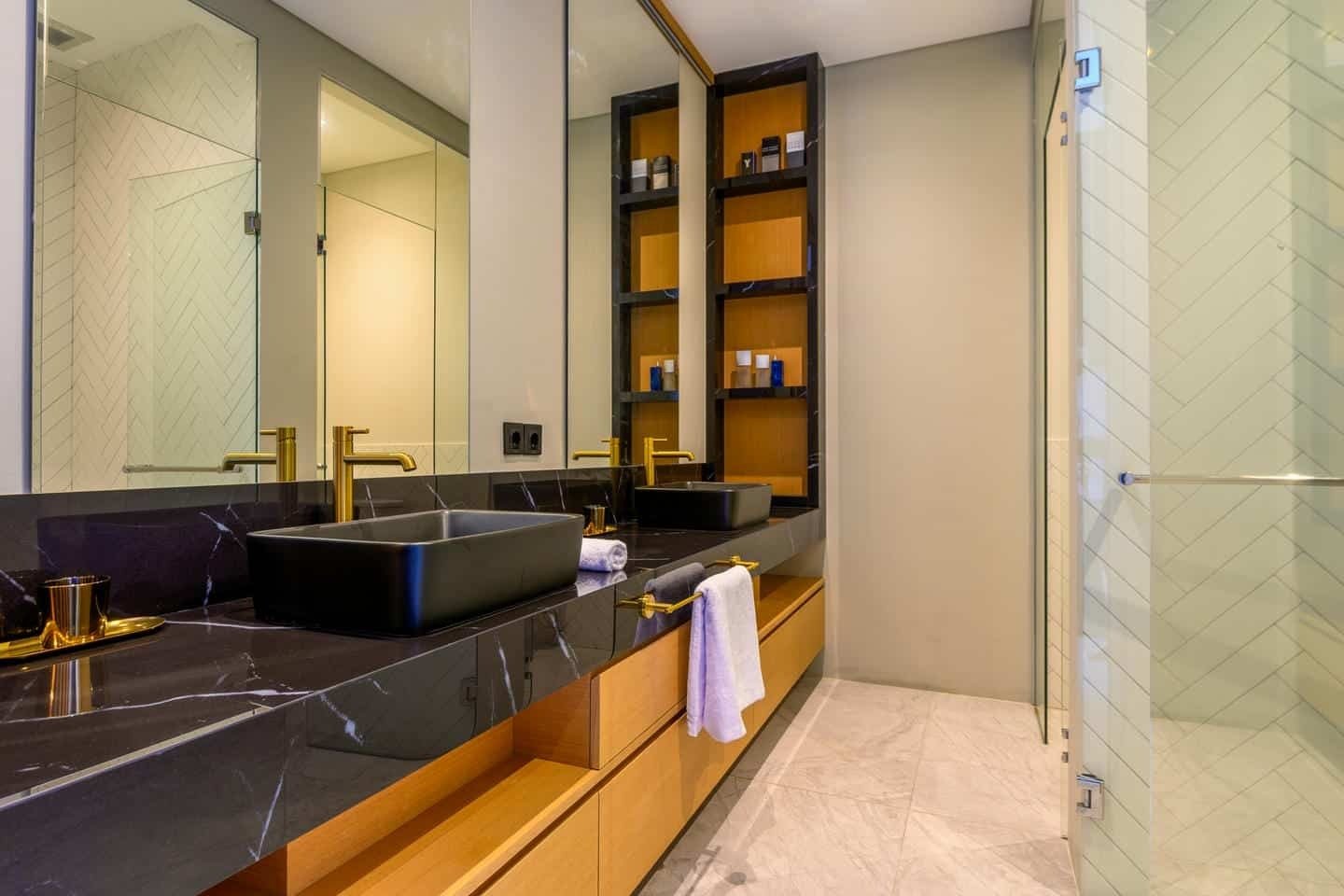 The villa offers four spacious bedrooms, each with private bathrooms and ocean views. Two bedrooms are located on the third floor and two on the fourth floor, ensuring privacy and elevated outlooks. A dedicated staff room is positioned on the first floor for operational convenience.