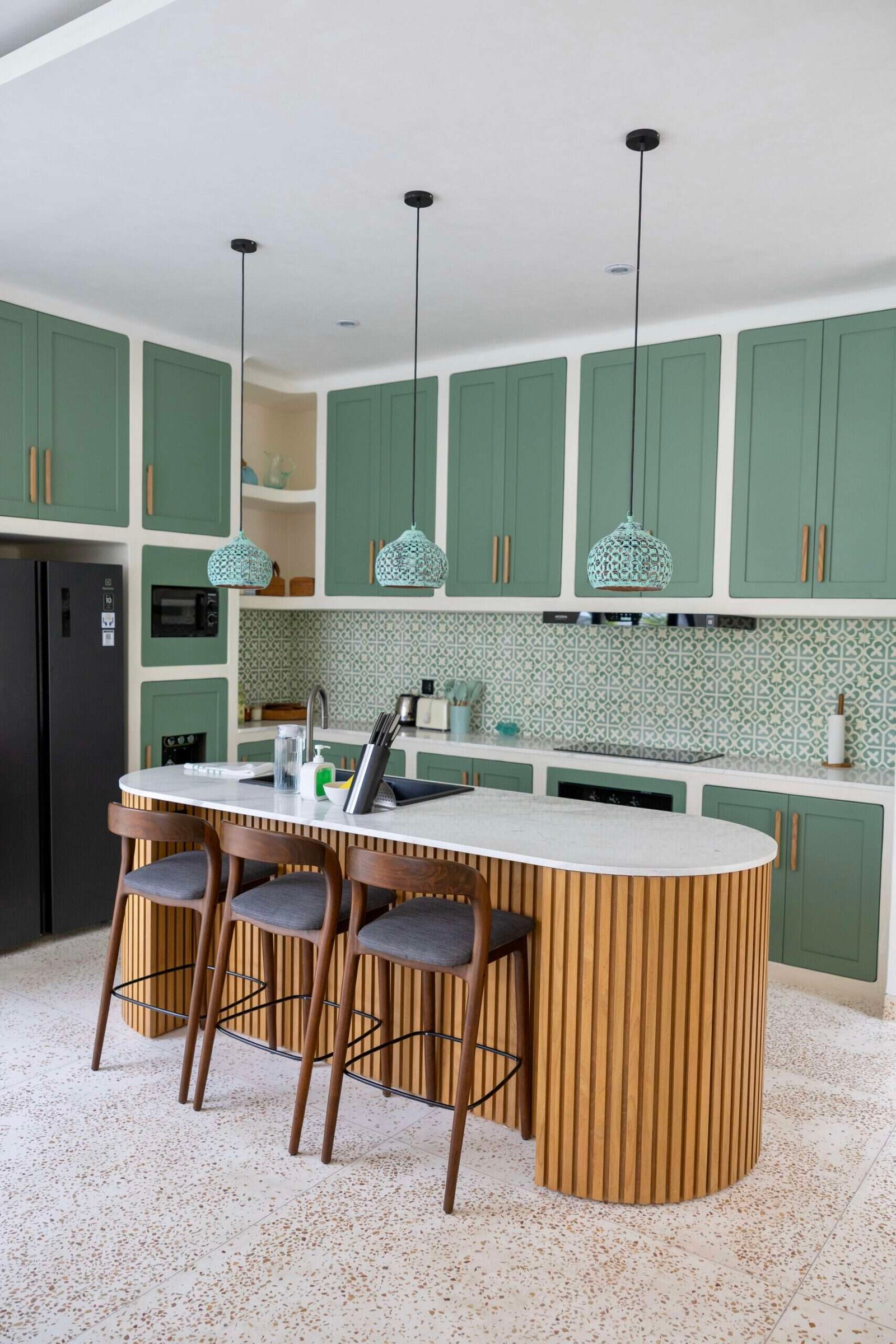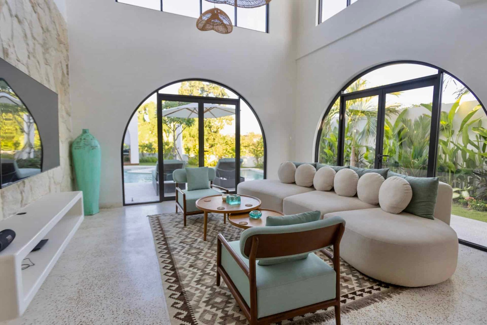 Expansive open-plan living and dining areas connect seamlessly to a modern, fully equipped kitchen, creating an inviting space for both daily living and entertaining. Mediterranean architectural details blend harmoniously with tropical materials, resulting in a warm yet sophisticated ambiance.